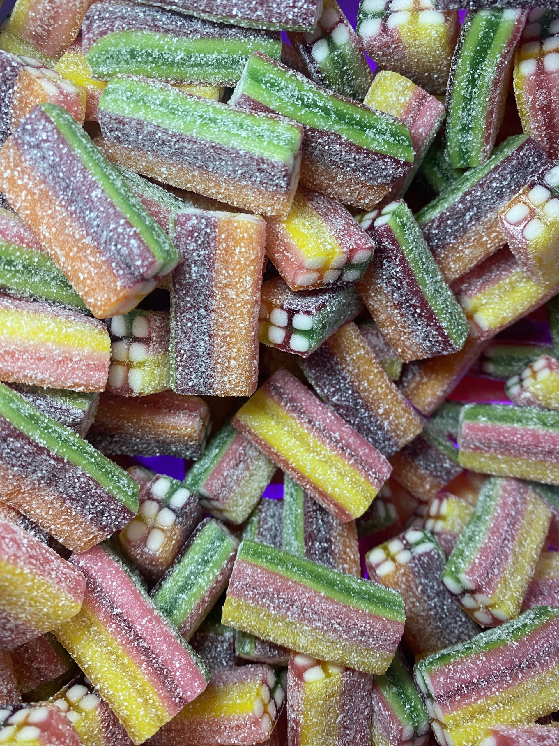 ZLOŽENIE: Cukor, glukózo-fruktózový sirup, pšeničná múka (lepok), škrob, rastlinný tuk (palma), želatína, okysľujúce látky (kyselina jablčná, kyselina citrónová, kyselina mliečna), arómy, regulátory kyslosti (laktát sodný, citran sodný, E331, E350), soľ, emulgátor: mono- a diglyceridy mastných kyselín, zvlhčovadlo: glycerol, farbivá: E102, E110, E129, E133. E102, E110 a E129 môžu nepriaznivo ovplyvňovať činnosť a pozornosť detí. Môže obsahovať stopy sóje a horčice.